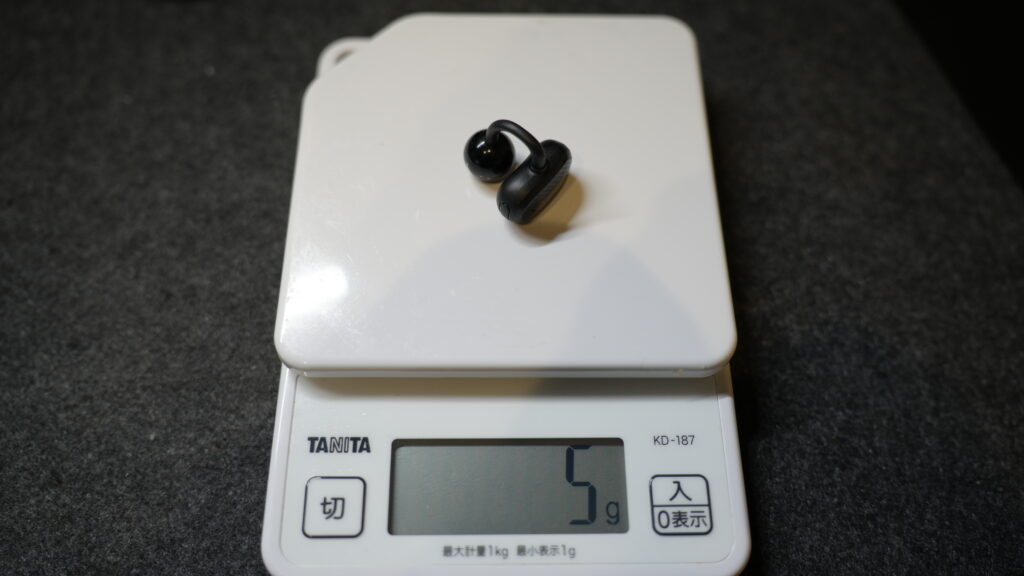 本体は片耳で約5gと非常に軽く、アーム部分は柔らかくしなやかで、長時間つけていても耳への負担がほとんどありません。